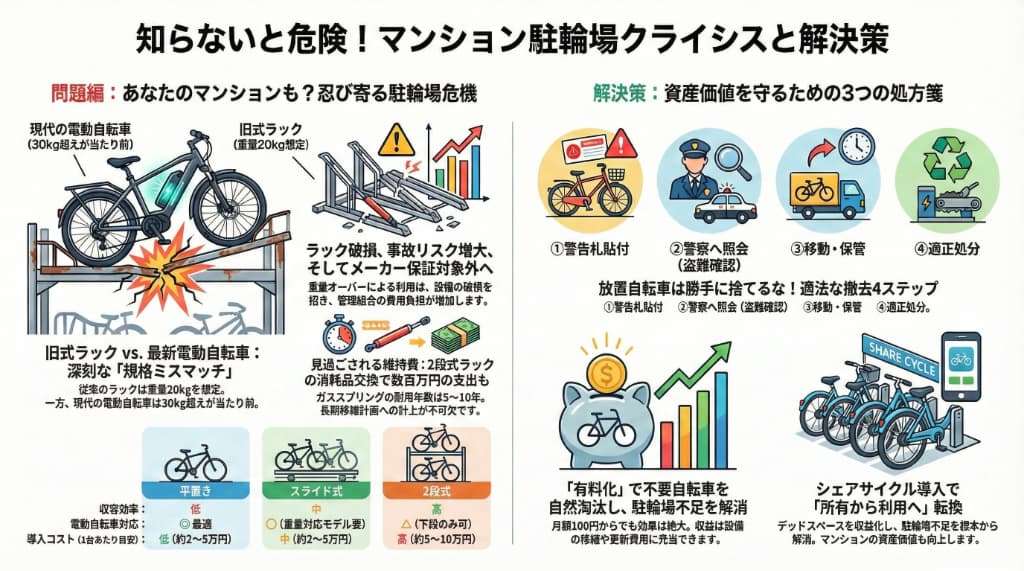 本記事では、こうしたマンション駐輪場にまつわる複合的な課題について、物理的・経済的・法的な視点から包括的に解説します。