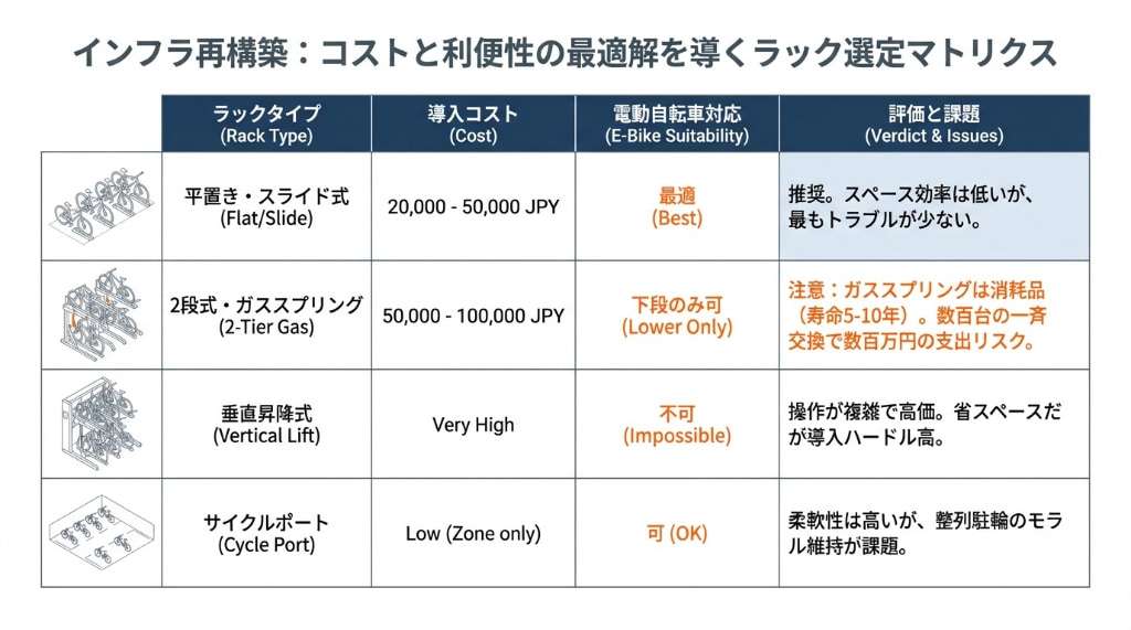 設備更新の判断基準:各種ラック方式のコストと電動自転車対応