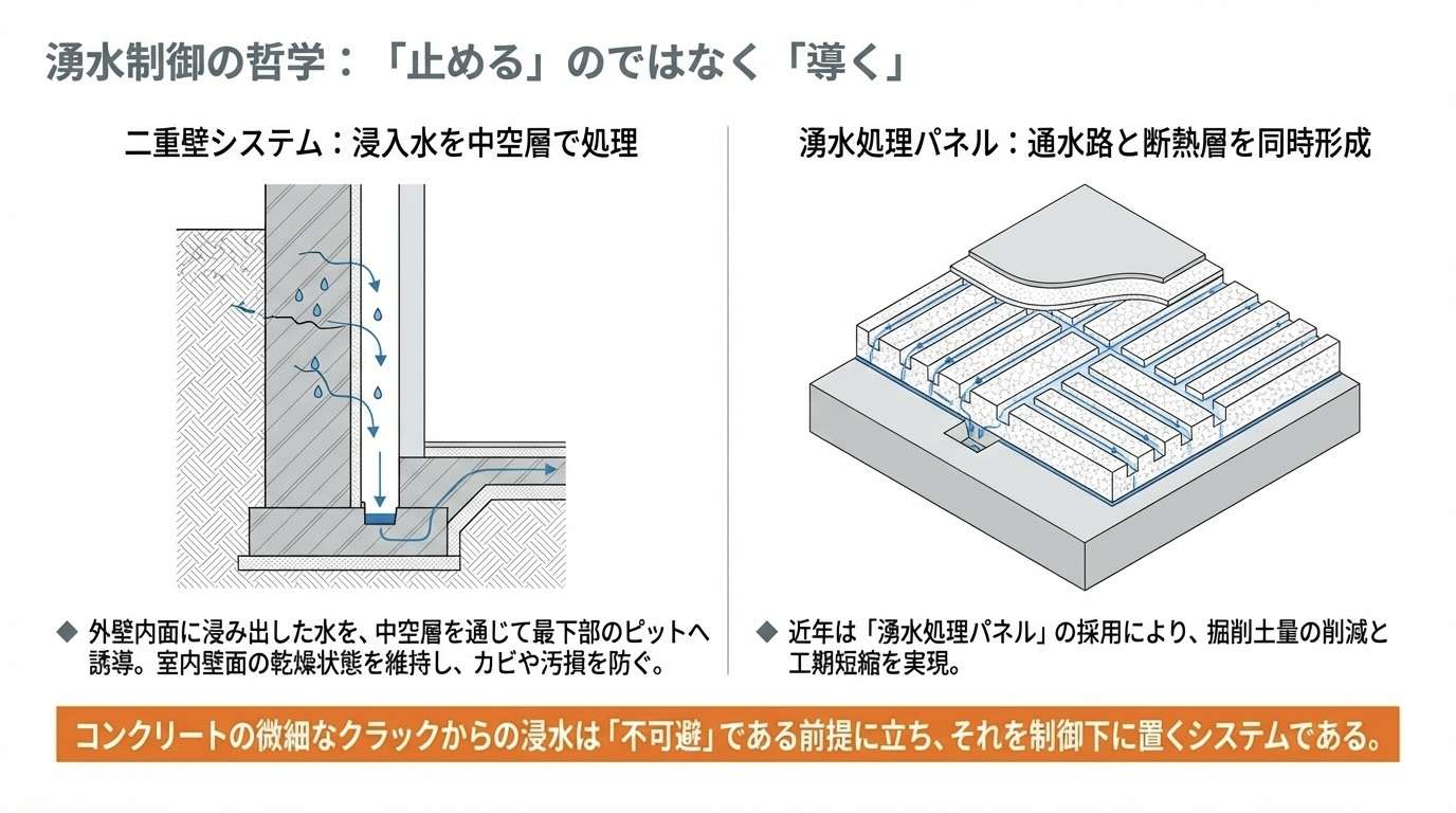 コンクリートの隙間から浸入する地下水を完全に止めるのは困難です。 そのため、「二重壁」などで浸入水を適切に排水ルートへ導き、制御する仕組み(導水設計)が採用されています。