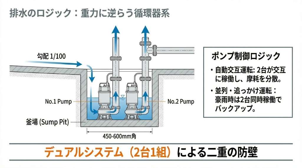 このように、地下ピットの排水システムは、物理的な勾配による集水と、二重化された機械設備による排出という、幾重もの安全策によって成り立っています。 したがって、点検時に「釜場に水がある」こと自体は正常ですが、「釜場以外の場所に水が溢れている」あるいは「ポンプが常に回り続けている」といった状態は、システムのバランスが崩れているサインと捉えるべきです。