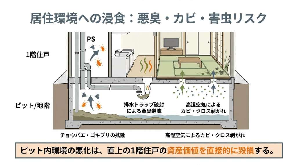 ピット内の環境悪化が及ぼす影響は、地下で作業する人だけにとどまりません。 1階の住戸をはじめとする居住エリアにも、様々な不快な現象となって現れます。