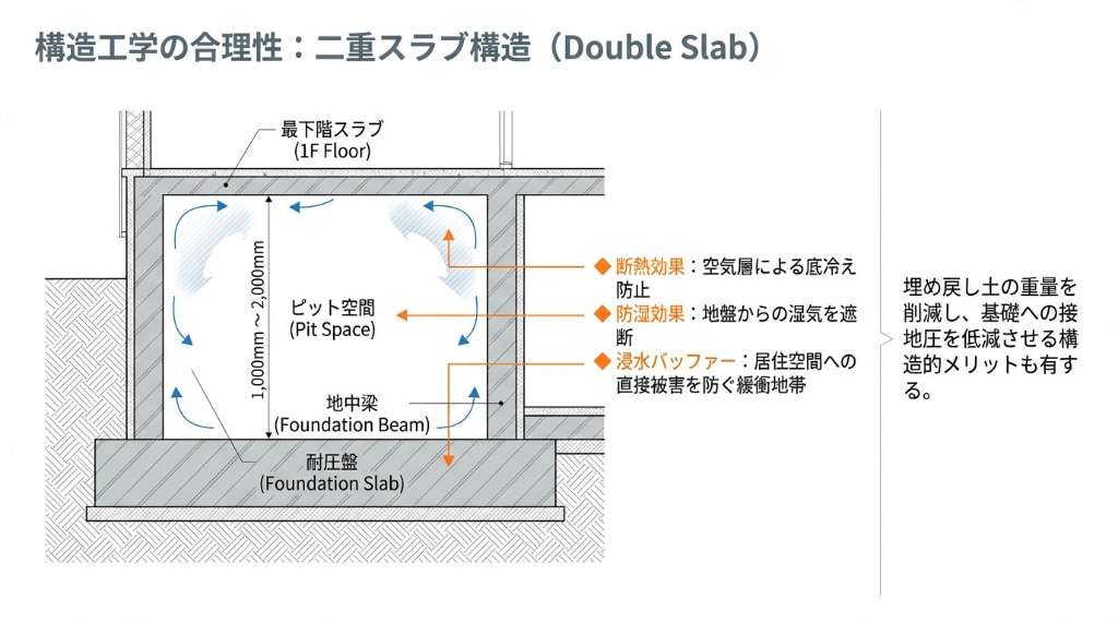 建物を支える巨大な地中梁(ちちゅうばり)の間を土で埋め戻さずに空間として利用することで、 建物全体の重量を軽くし、地盤にかかる負担を減らす構造的メリットがあります。