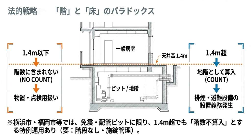 もう一つ、法的な判断で重要になるのが「階数」への算入問題です。 建物が「地上〇階・地下〇階」であるかという定義は、避難設備や消防設備の設置基準に直結するため、コストや安全管理の面で大きな影響を持ちます。 ここで実務上の大きな分岐点となるのが、「天井高1.4m」という基準です。