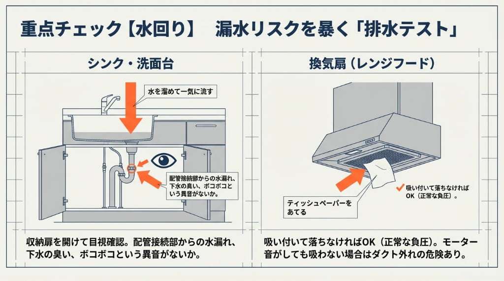 キッチン、浴室、洗面所、トイレといった水回りは、漏水事故に直結するリスクエリアです。外観だけでなく実際の「動作」確認が不可欠です。