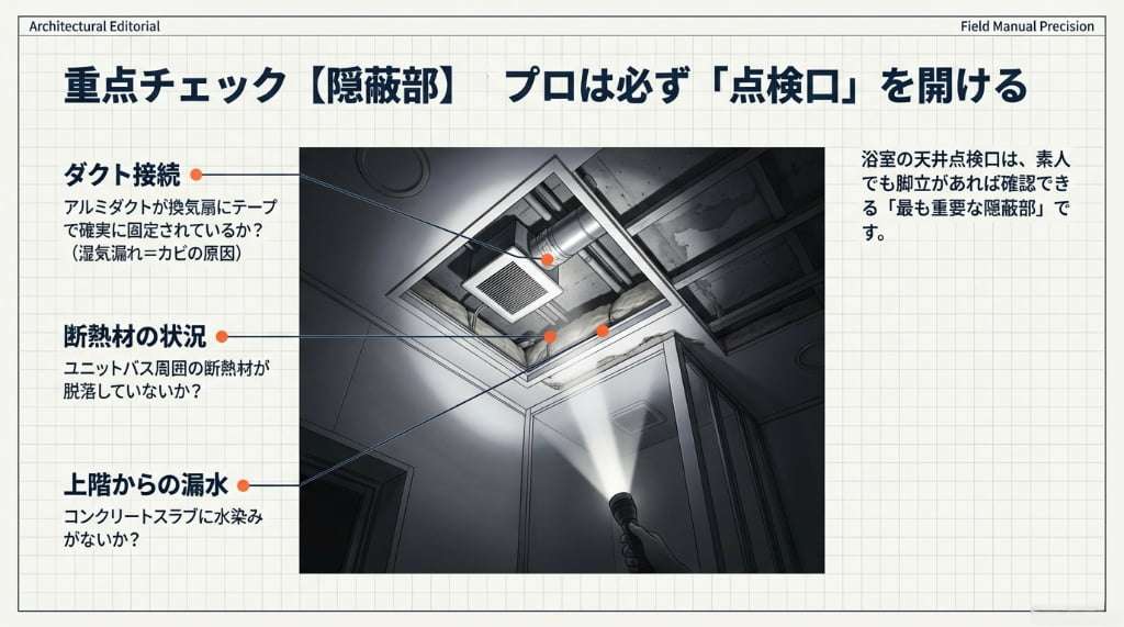 また、浴室の「天井点検口」はプロが最も重視するポイントです。脚立を用いて中を確認することで、以下の重大な不具合を発見できる可能性があります。