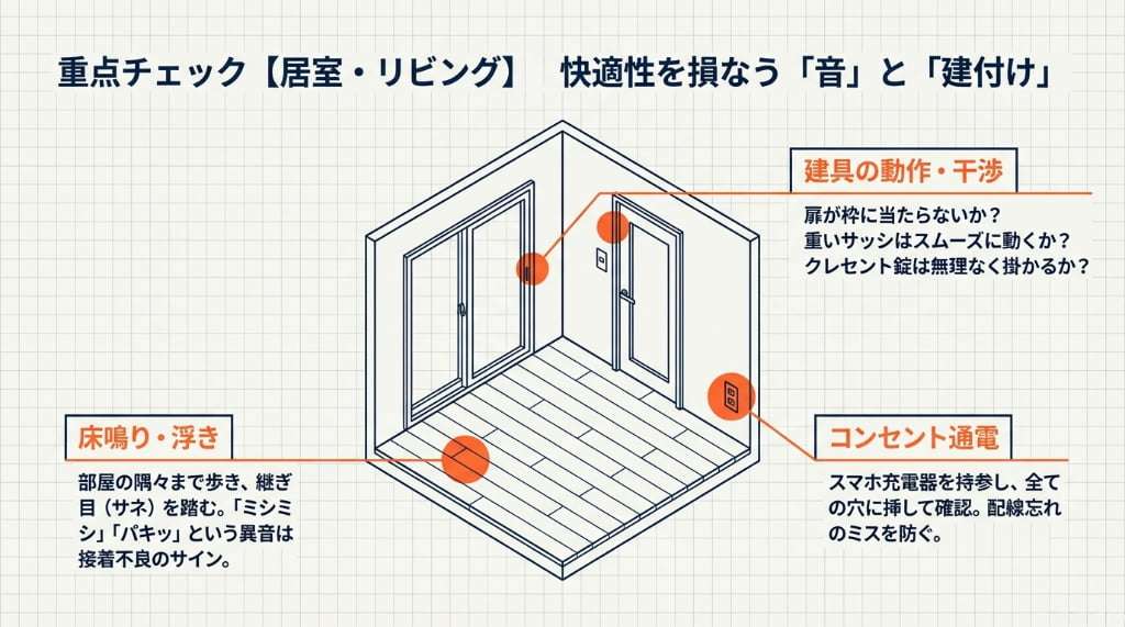 リビングや居室は長時間過ごす場所であるため、居住快適性に直結する床と建具の精度が重要になります。以下のポイントを重点的に確認しましょう。