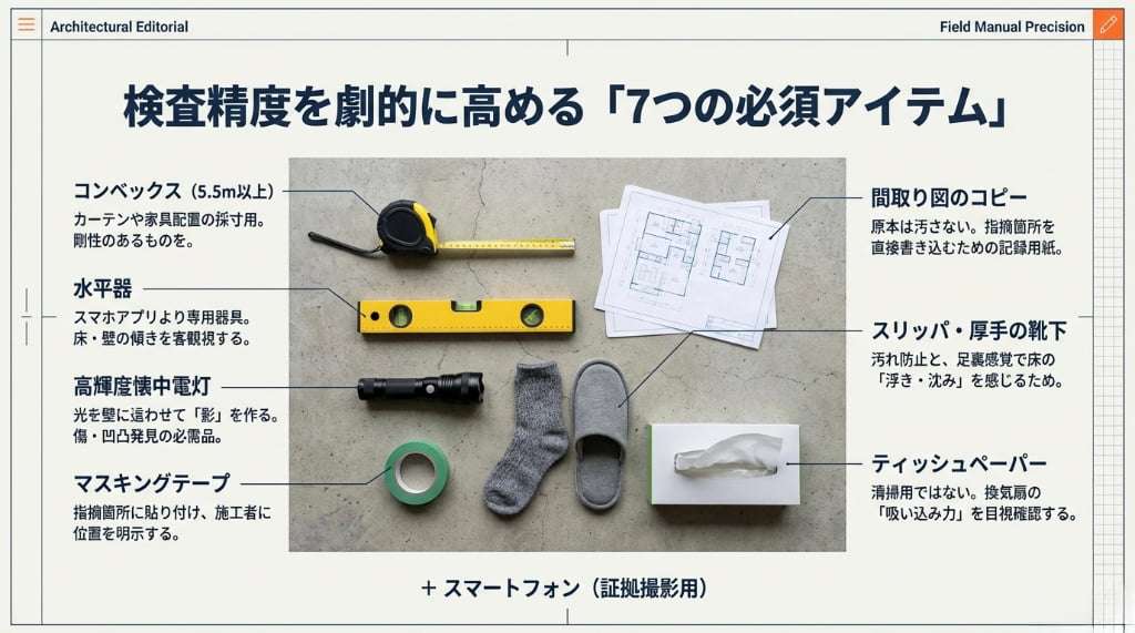 これらの道具を準備することで、単なる「見学」から、具体的根拠に基づいた「検査」へと質を高めることができます。 特にスマートフォンのカメラは、全ての指摘箇所を撮影し、証拠保全を行うために不可欠です。