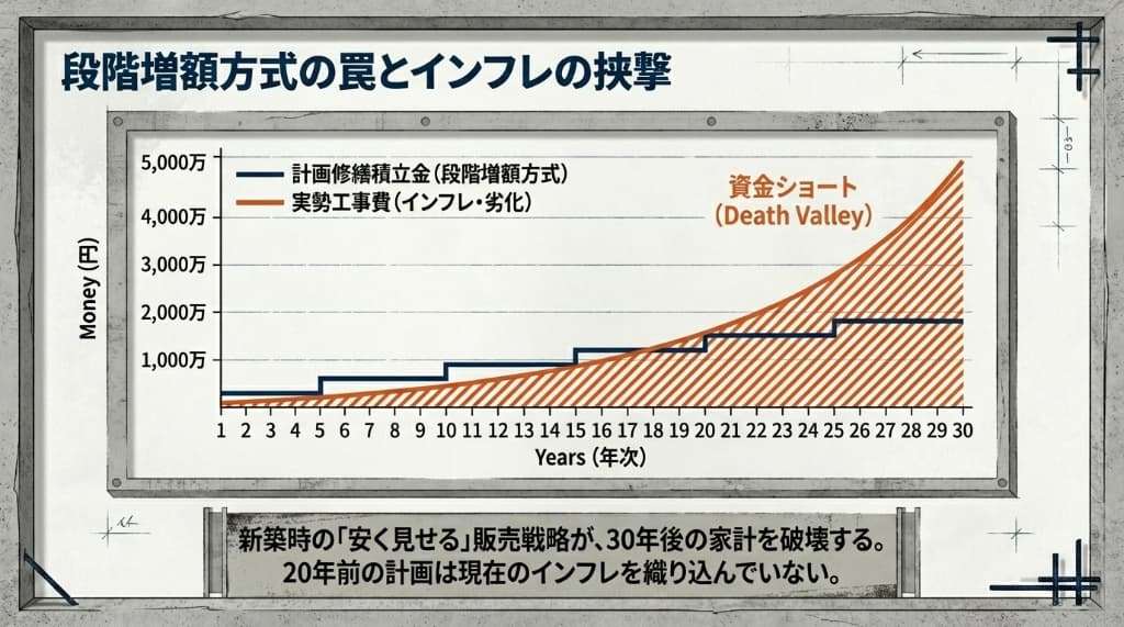 新築時の「段階増額方式」の計画が甘く、数億円単位で不足するケースが多発しています。