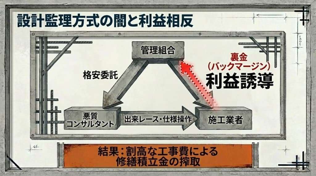 大規模修繕を進める際、管理組合をサポートするためにコンサルタント(設計監理方式)を雇うことが一般的です。 本来は組合の利益を守る立場ですが、このコンサルタント自身が悪徳業者だった場合、悲劇が始まります。