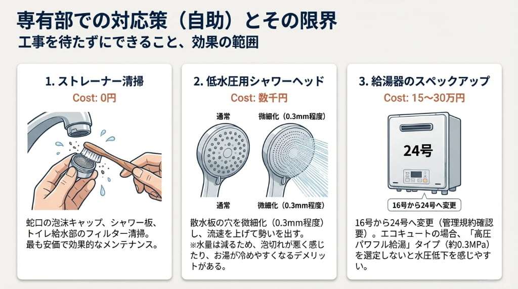「水圧を上げたい」と考えたとき、まずはご自身の住戸内(専有部)でできる対策から検討しがちですが、そこには物理的な限界と法的なリスクが存在します。 手軽にできる製品交換から、検討には慎重を要するポンプ設置まで、それぞれの効果と注意点を整理します。