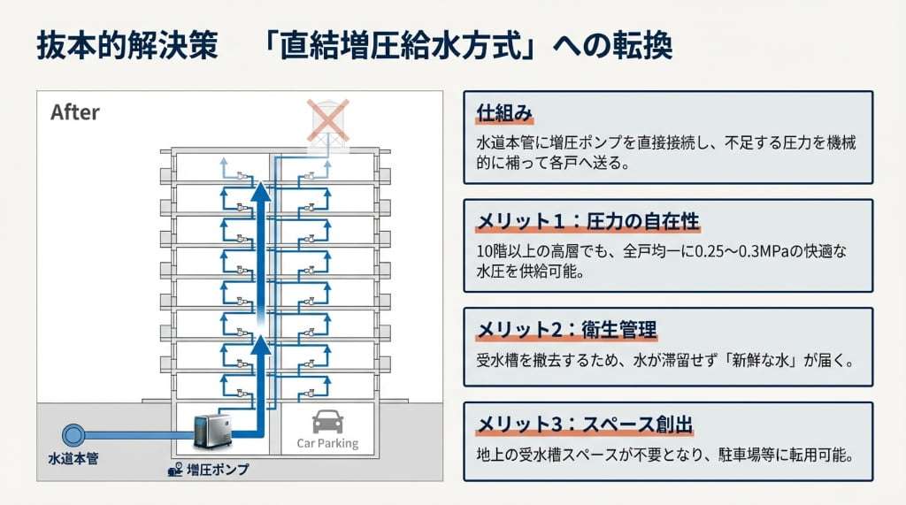 個別の対策に限界がある以上、マンション全体の水圧問題を抜本的に解決するには、管理組合主導による給水システムの刷新が最も合理的です。 現在、既存マンションの改修において主流となっているのが、「直結増圧給水方式」への切り替えです。