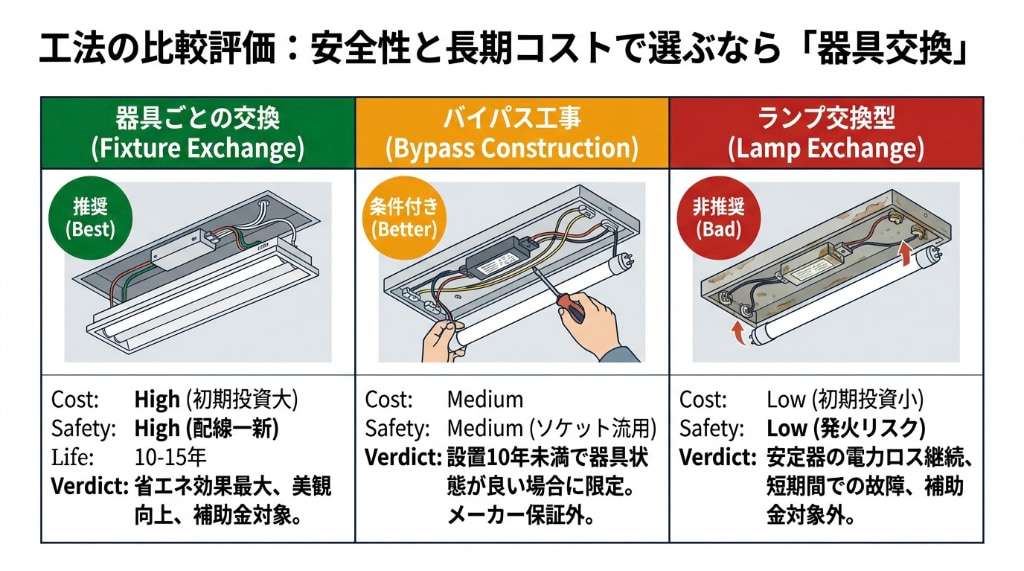 ランプ交換型は発火リスクや安定器故障による二重投資の懸念があります。初期費用がかかっても器具交換が最も安全で合理的です。