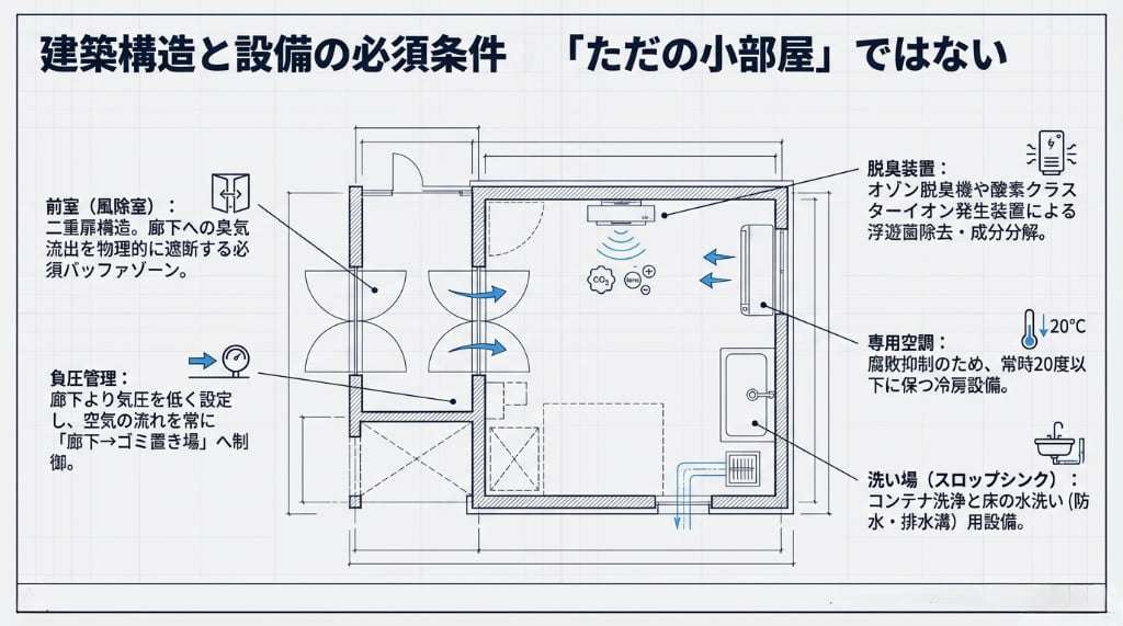 二重扉構造と、空気がゴミ置き場の中へ吸い込まれる気圧設定が不可欠です。