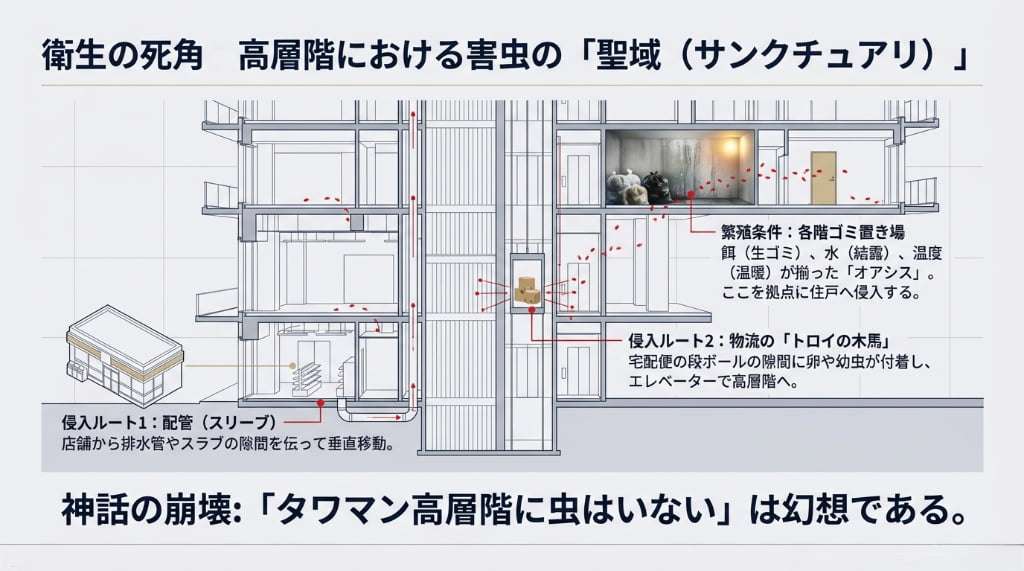 しかし、現実には高層階であっても害虫の発生事例は多数報告されており、「タワマンなら虫が出ない」というのは一種の神話に過ぎない側面があります。 特に、各階ゴミ置き場という環境は、適切に管理されていなければ、害虫にとっての「聖域(サンクチュアリ)」となり得るリスクを孕んでいます。 彼らは空を飛んでくるのではなく、建物の内部構造や私たちの生活物流を利用して、虎視眈々と上層階へと侵入してくるのです。