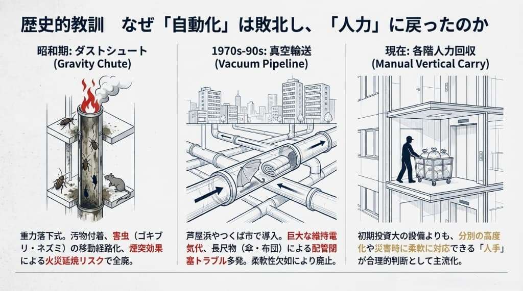 こうした歴史を経て、現代では初期投資が巨大で柔軟性に欠ける自動化システムよりも、あえて「各階置き場+人力回収」という方式が、最も合理的で災害時にも強いスタンダードとして定着したのです。