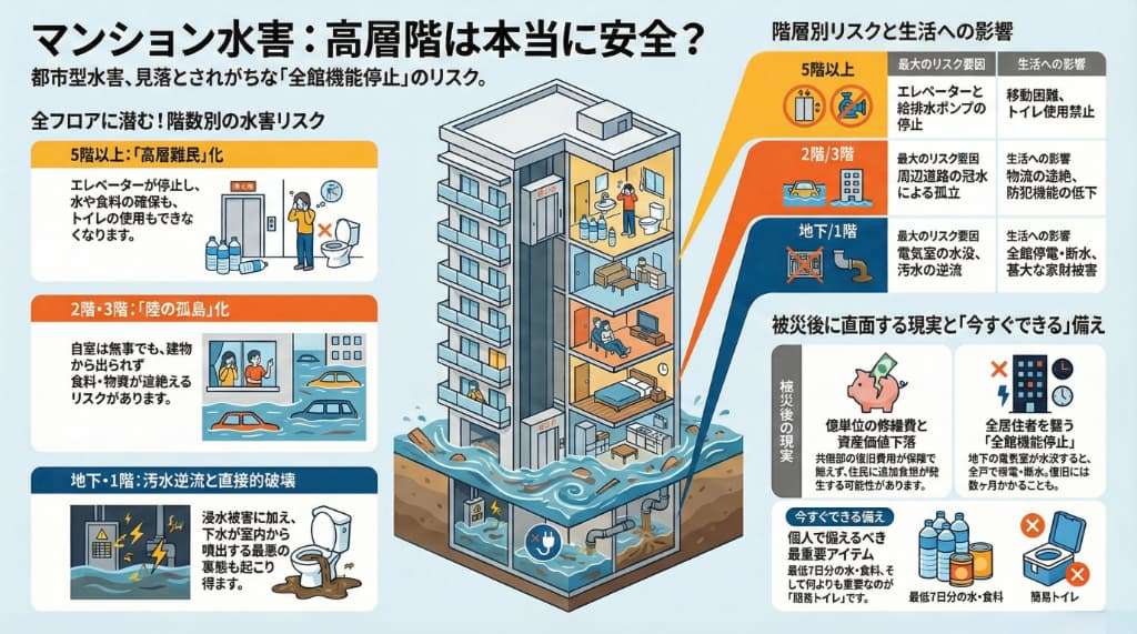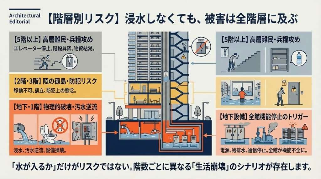 低層階の浸水リスクと、高層階の孤立リスクの違い。