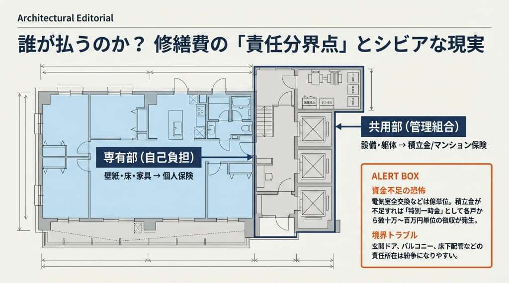 まず理解すべきは、被災箇所の区分です。 マンションには、個人が所有権を持つ「専有部分」と、区分所有者全員で共有する「共用部分」があり、それぞれ復旧費用の出所が異なります。