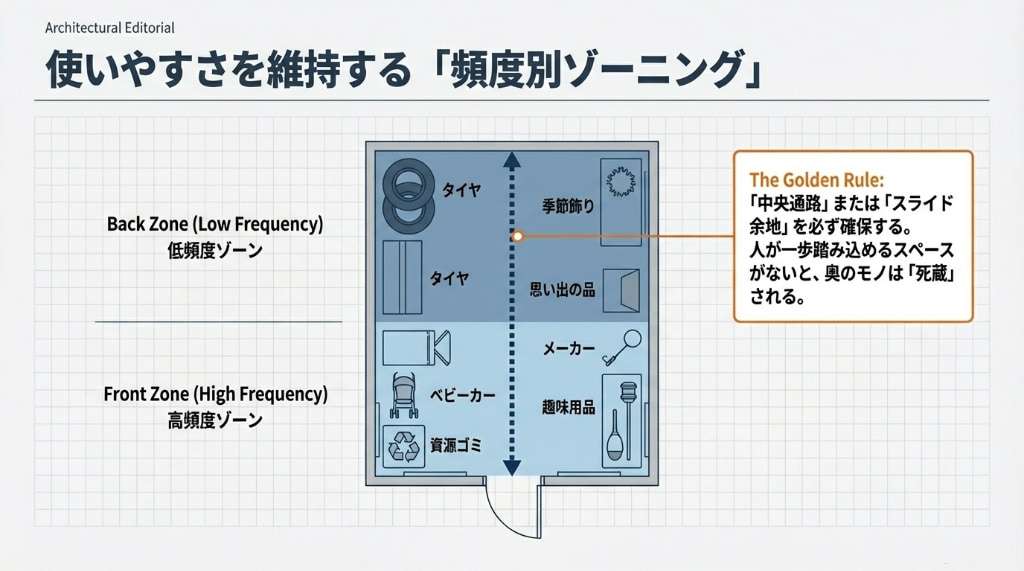 どんなに荷物を詰め込んでも、人が一歩踏み込める、あるいは奥のラックを引き出せるだけの「中央通路」や「スライド余地」を確保しておくことが重要です。 使用頻度に基づいて手前と奥を使い分けることで、トランクルームは「物置」から「使いやすいクローゼット」へと進化します。