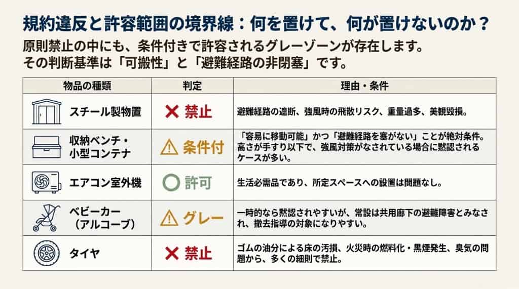つまり、「置いていい物」と「いけない物」の境界線は、「緊急時に子供や高齢者でもすぐに動かせるか(可搬性)」と、「避難設備を物理的に塞いでいないか」という2点に集約されます。