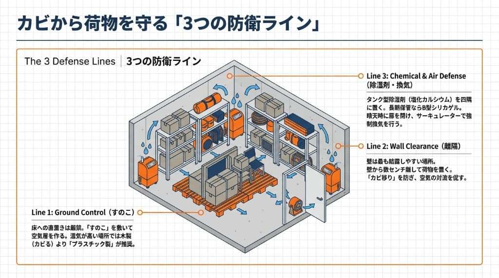 コンクリートに囲まれた密閉空間は、油断するとすぐにカビの温床となります。 「すのこ」「壁からの離隔」「除湿剤」の三種の神器を用い、物理的かつ化学的に環境をコントロールすることが不可欠です。