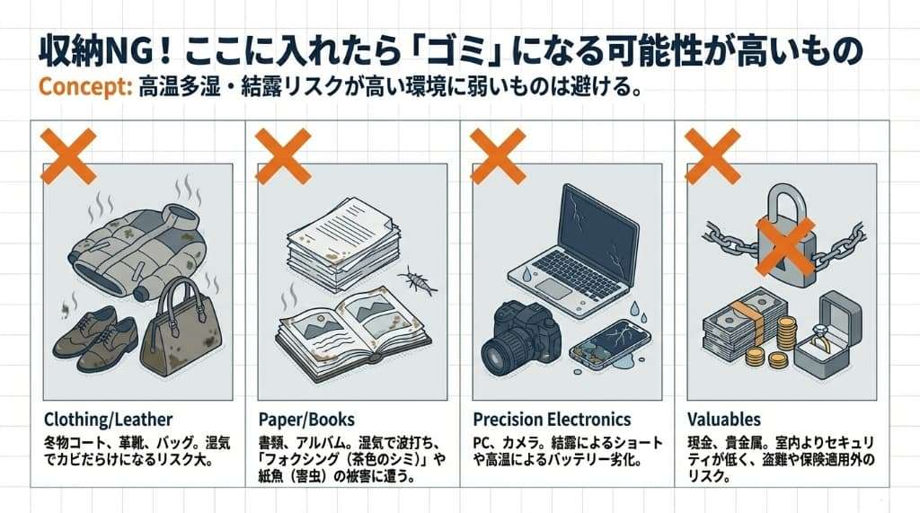 トランクルームは便利な空間ですが、何でも入れて良い「魔法の箱」ではありません。 管理規約による制限や、物理的な環境特性(温湿度変化)により、収納してはいけない「NG品」が明確に存在します。