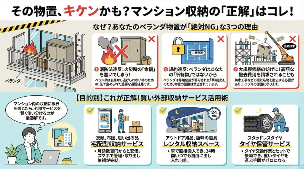 ここまで詳しく解説してきた通り、安易な自己判断でベランダや玄関前に物置を設置することは、ご自身と家族、そして隣人の安全を脅かすリスクの高い行為であり、決して推奨できるものではありません。
