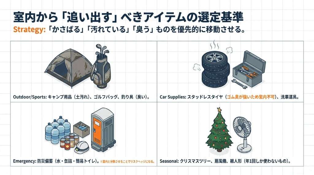基本的には、室内空間を占有してしまっている「かさばるもの」「汚れているもの」「使用頻度が低いもの」を優先的に移動させる戦略が有効です。