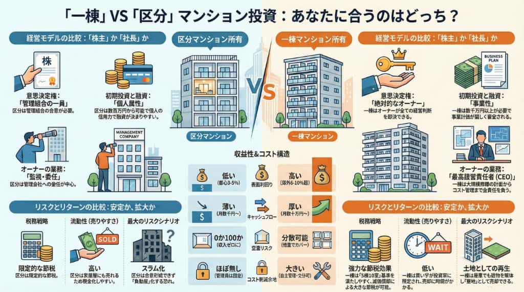 ここまで見てきた通り、一棟マンションと区分マンションは、同じ「大家」でありながら、その実態は「中小企業の社長」と「株主」ほどに異なります。