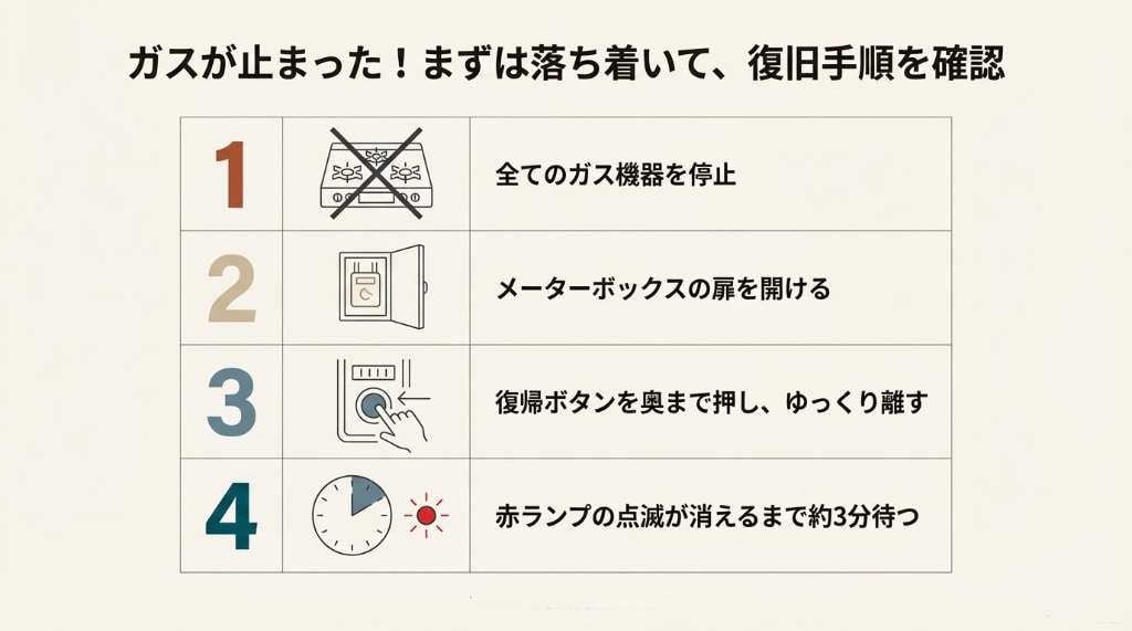 ガスを再び使えるようにするためには、メーターボックス内にあるガスメーター本体の「復帰操作」が必要不可欠となります。
