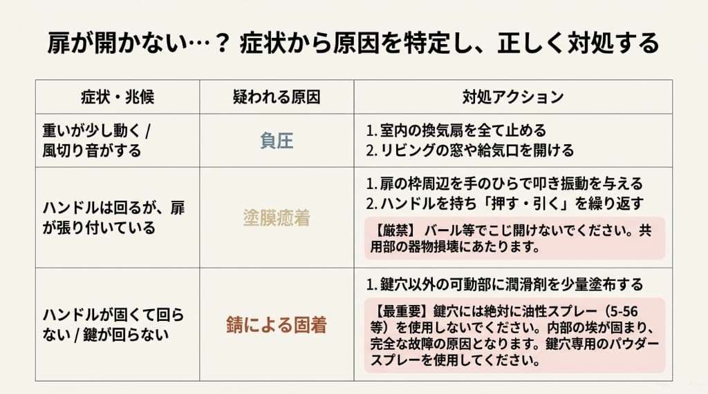 なぜ扉が開かない?「負圧」と「物理的劣化」の原因切り分け